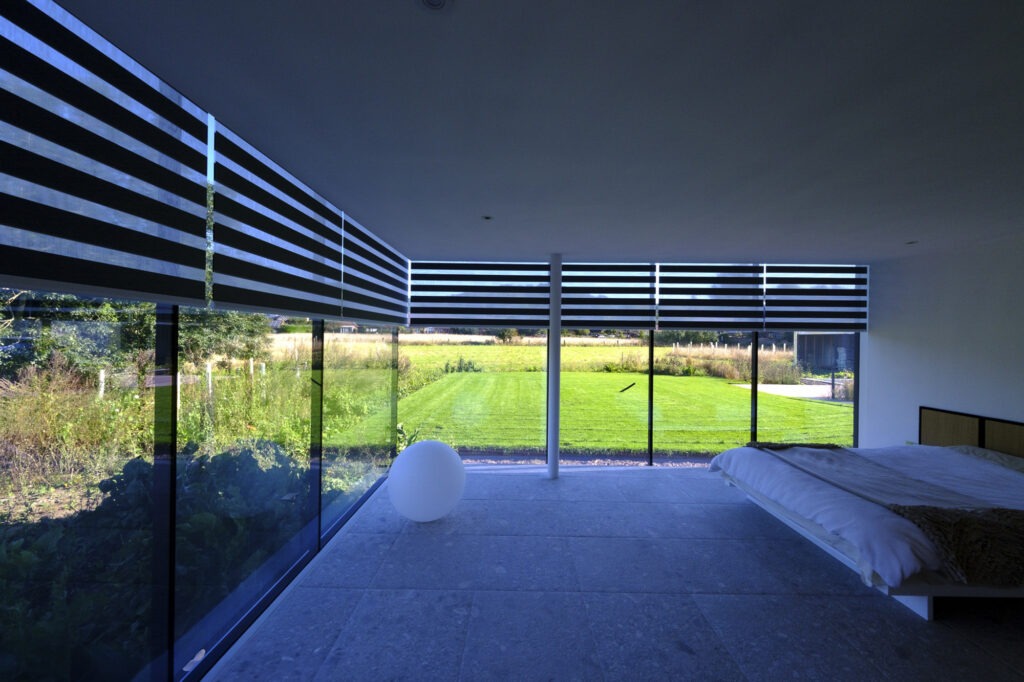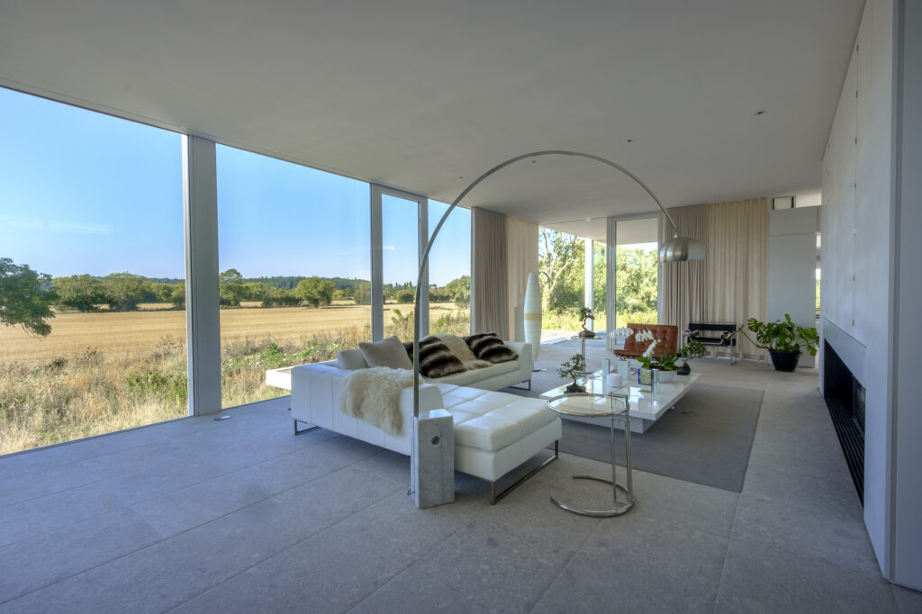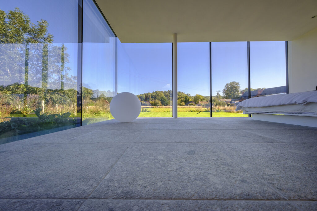 This guest house utilised structural glazing to create a highly glazed, contemporary design. The floor to ceiling glazing allows to enjoy the rural views. From the inside, the glass to glass corner connections allows floods of natural light to enter the space. Thanks to the thermally broken properties of the invisio system there is a comfortable temperature all year round.